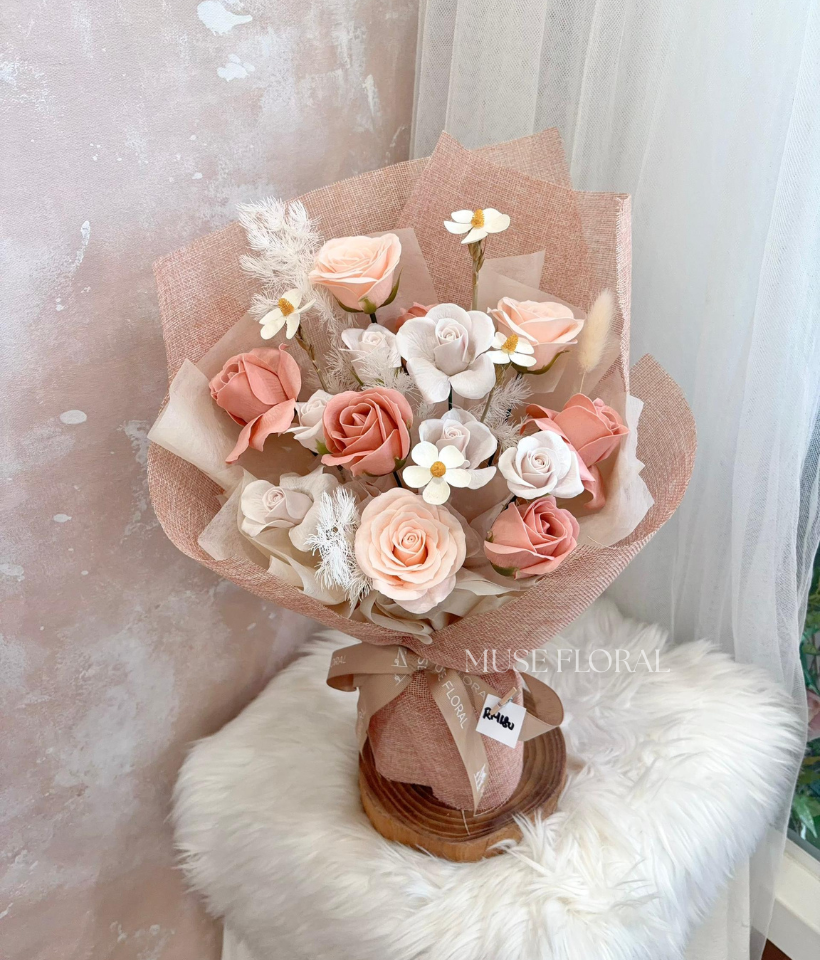 Delight in the lasting charm of our hand-crafted soap flower bouquets, featuring lifelike roses and delicate blooms in various colors.