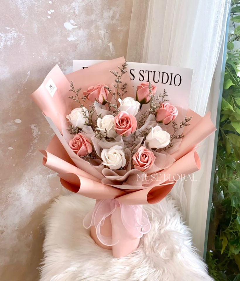 Delight in the lasting charm of our hand-crafted soap flower bouquets, featuring lifelike roses and delicate blooms in various colors.