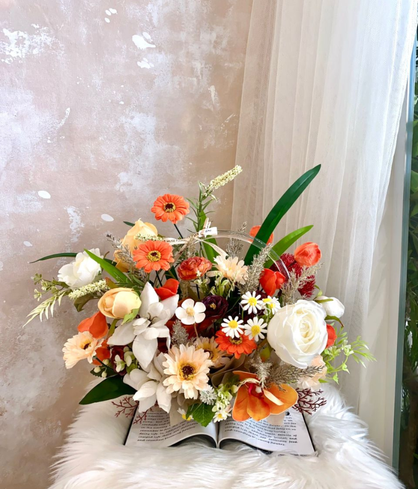 Delight in the lasting charm of our hand-crafted flowers box, featuring a stunning arrangement of lifelike artificial bloom in delighted hues, accented with delicate greenery for a touch of natural beauty.