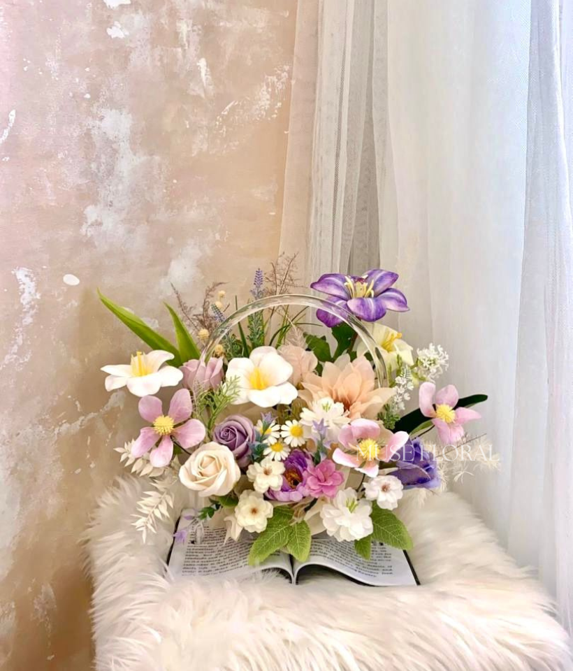 Delight in the lasting charm of our hand-crafted flowers box, featuring a stunning arrangement of lifelike artificial bloom in delighted hues, accented with delicate greenery for a touch of natural beauty.